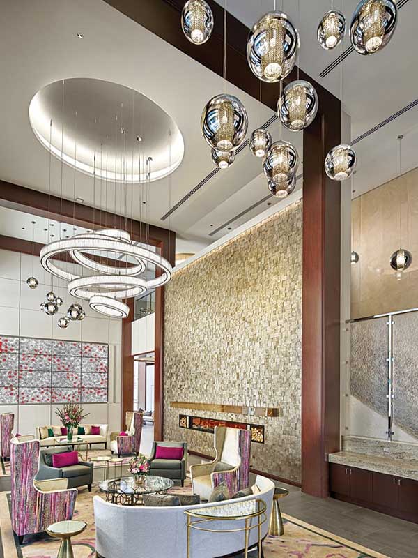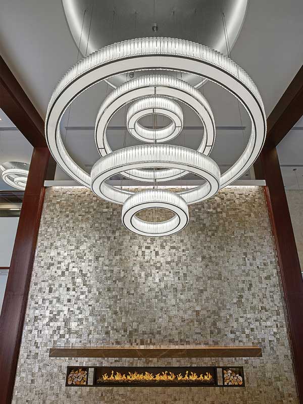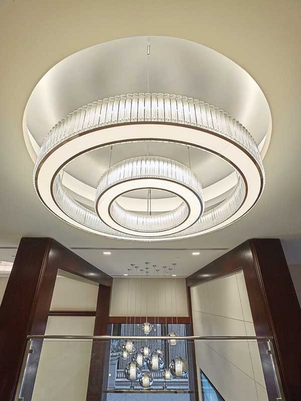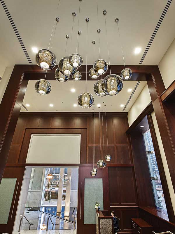 This elegant commercial Chicago building features our VISO Bolio clusters in silver gloss finish alongside 2 custom ring canopies that shine overhead the central social room.
