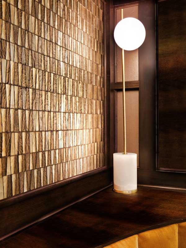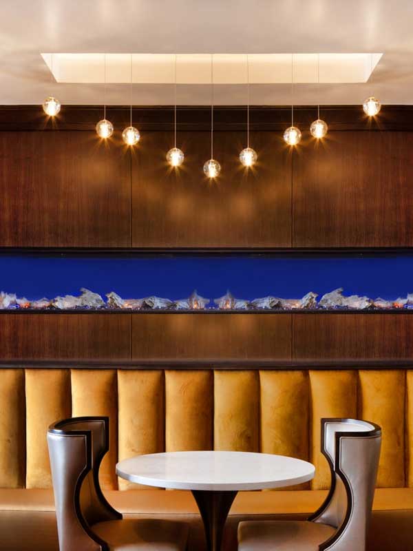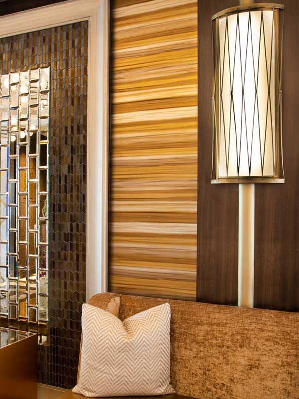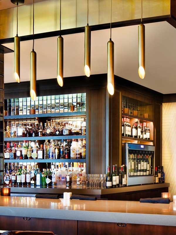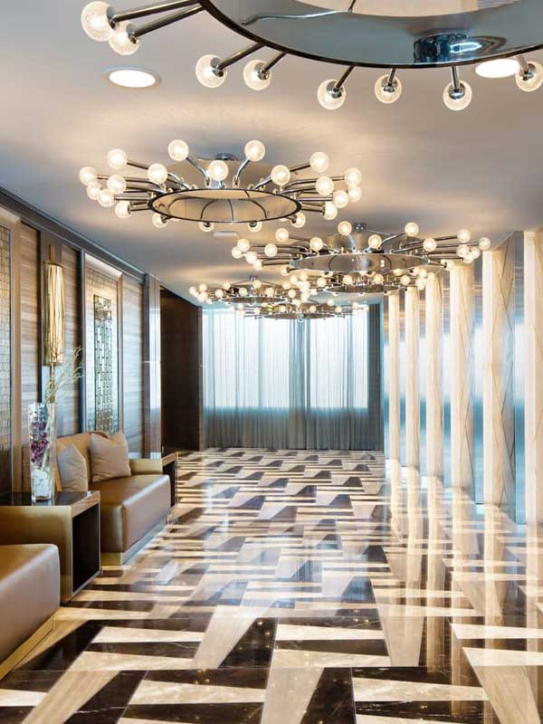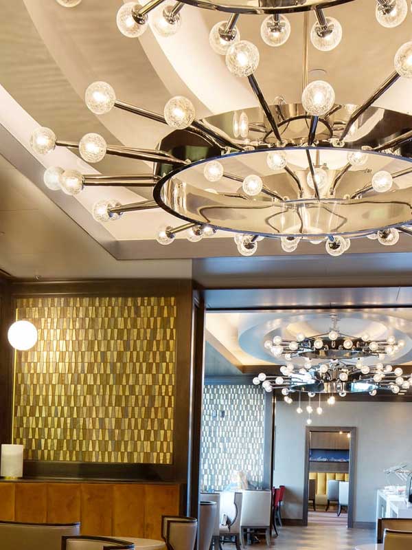 The Mohegan Sun Casino highlights custom VISO pieces from chandeliers to pendants brushed with a bronze and silver finish.