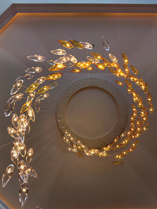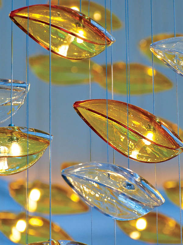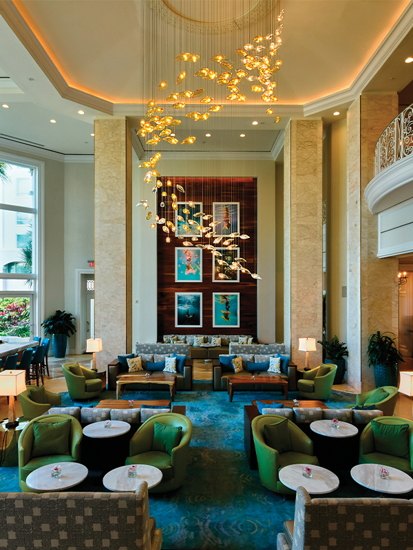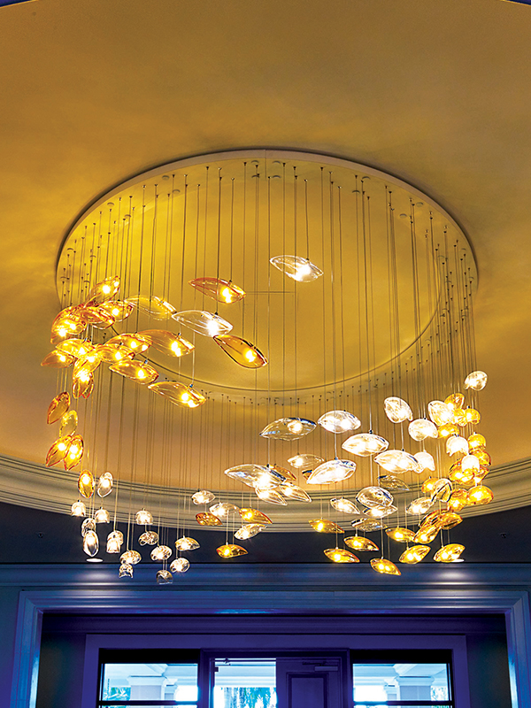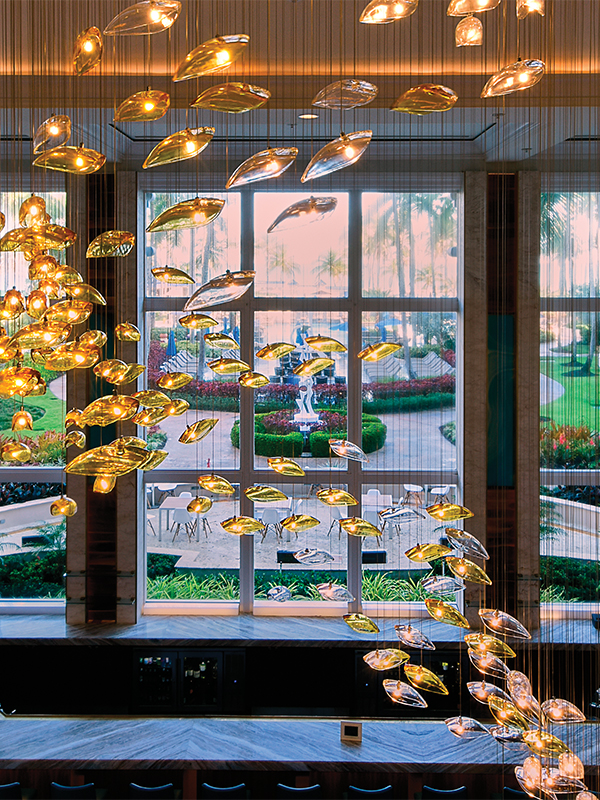 Custom VISO glass chandelier adorns the lobby of the Ritz Carlton in Puerto Rico. Made with hand-modded glass pendants, this custom piece was designed to be a show stopper.
